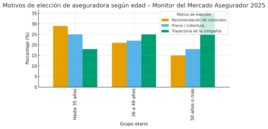 En los segmentos más jóvenes gana peso la recomendación de conocidos y el precio, mientras que en los mayores de 50 años predomina la confianza en la trayectoria de la aseguradora.
